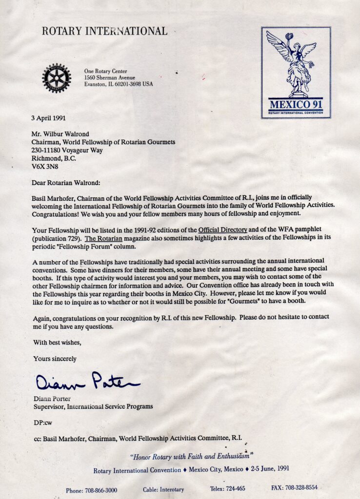 Un anno dopo, il 3 aprile 1991, con la benedizione di almeno 4 governatori distrettuali di 4 diversi distretti (come richiesto dal R.I.) e 22 soci di 7 Rotary Club vicini del Distretto 5040, il Capitolo 1-Richimond, British Columbia, Canada, ricevette l’approvazione dal Rotary International.