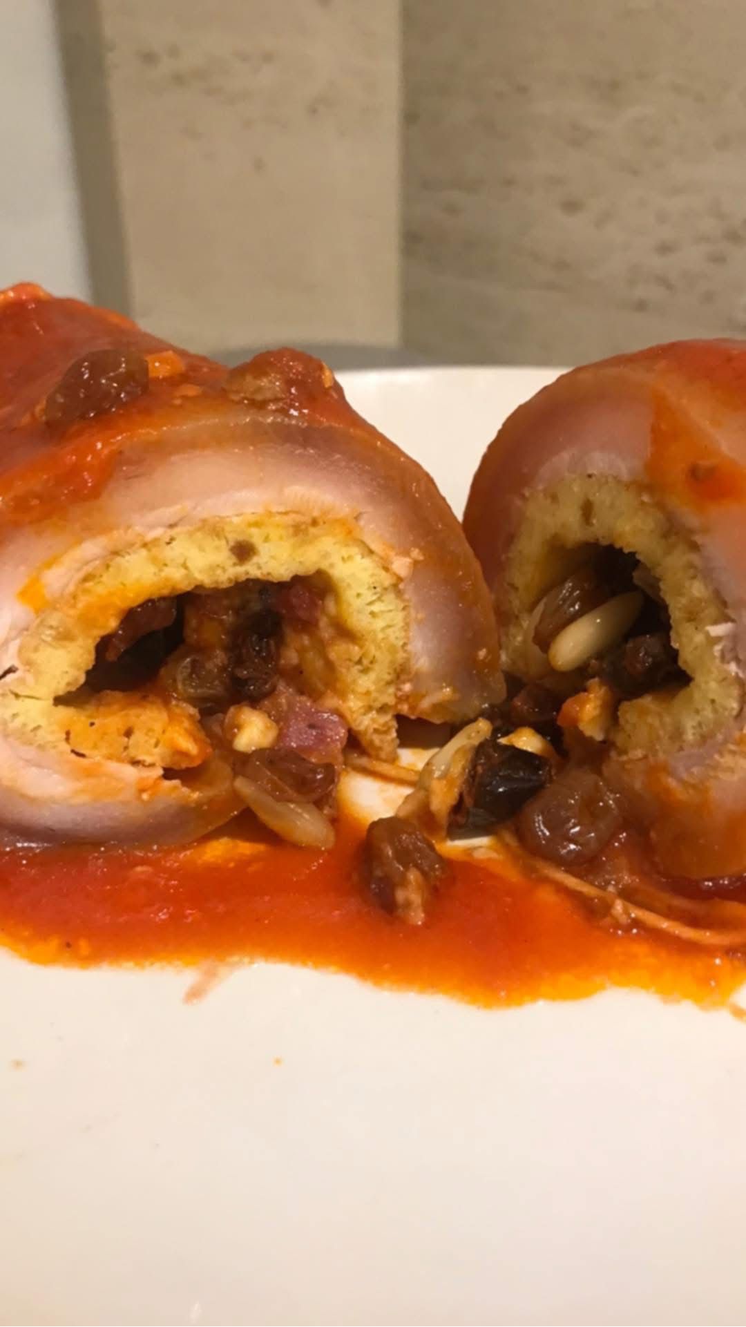 | 5. | Dopo aver completato il tutto, soffriggere gli involtini e cuocerli nella passata di pomodoro con il classico condimento di olio. Sale pepe e zucchero. |
