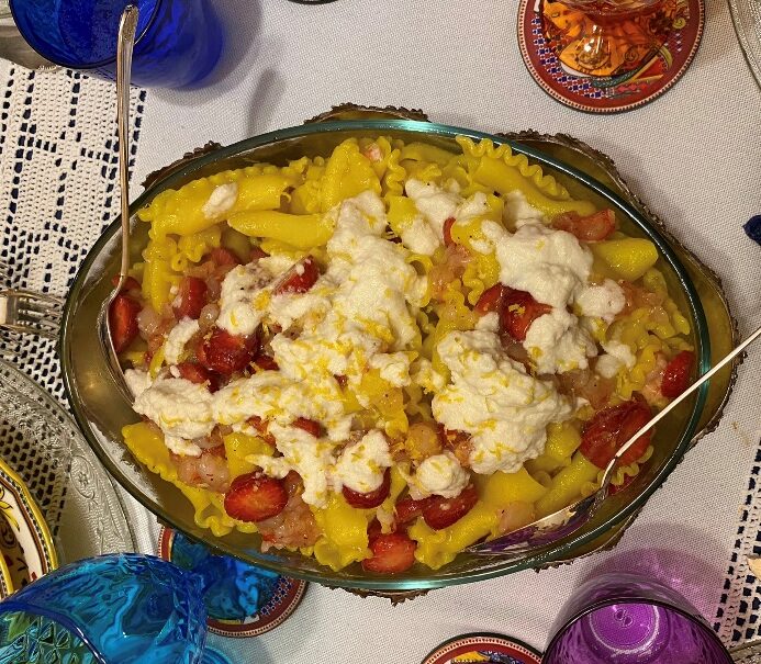 Pasta al succo di limone con tartar di gambero rosso di Mazara e fragole